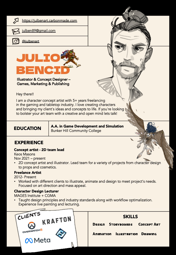 I am a character concept artist with 5+ years freelancing in the gaming and tabletop industry. I love creating characters and bringing my client's ideas and concepts to life. The challenge of making new and interesting visual elements that captivate my audience is what brought me to this field. If you're looking to bolster your art team with a creative and open mind lets talk!